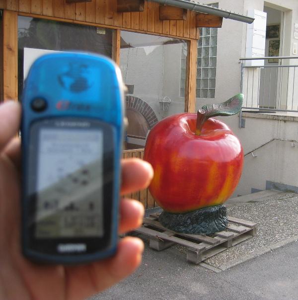 N 49° 11.999 E 009° 31.604.This apple is advertizing the fruit shop from a local farmer in Cappel / Germany.TFTCGreetings from Germany,GeoFaex.